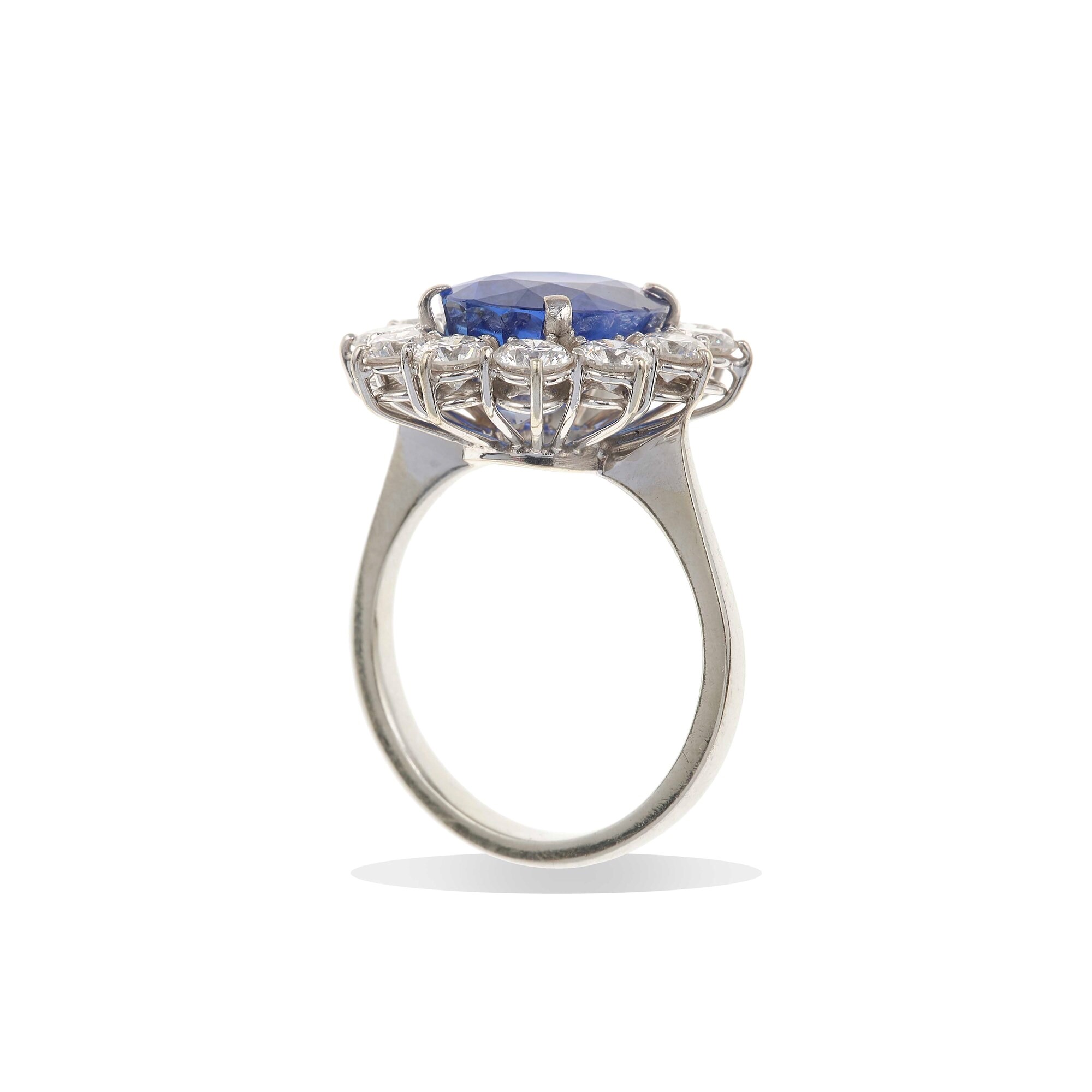 Anello con zaffiro Sri Lanka di ct 5.40 circa, nessuna indicazione di riscaldamento, e diamanti per ct 1.68 circa
