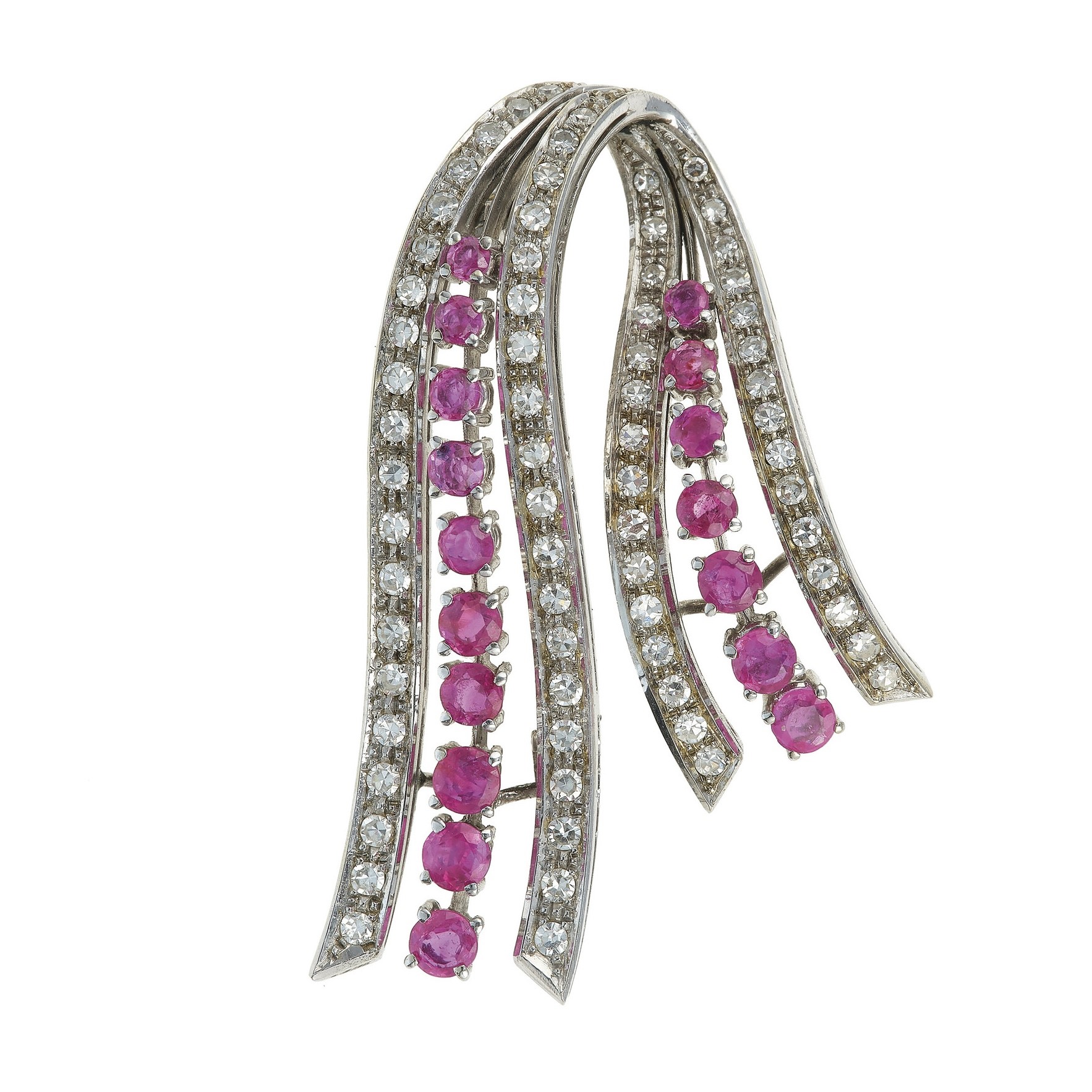 Spilla con diamanti e rubini montatura in oro bianco 750/1000, gr. 13,0 cm...