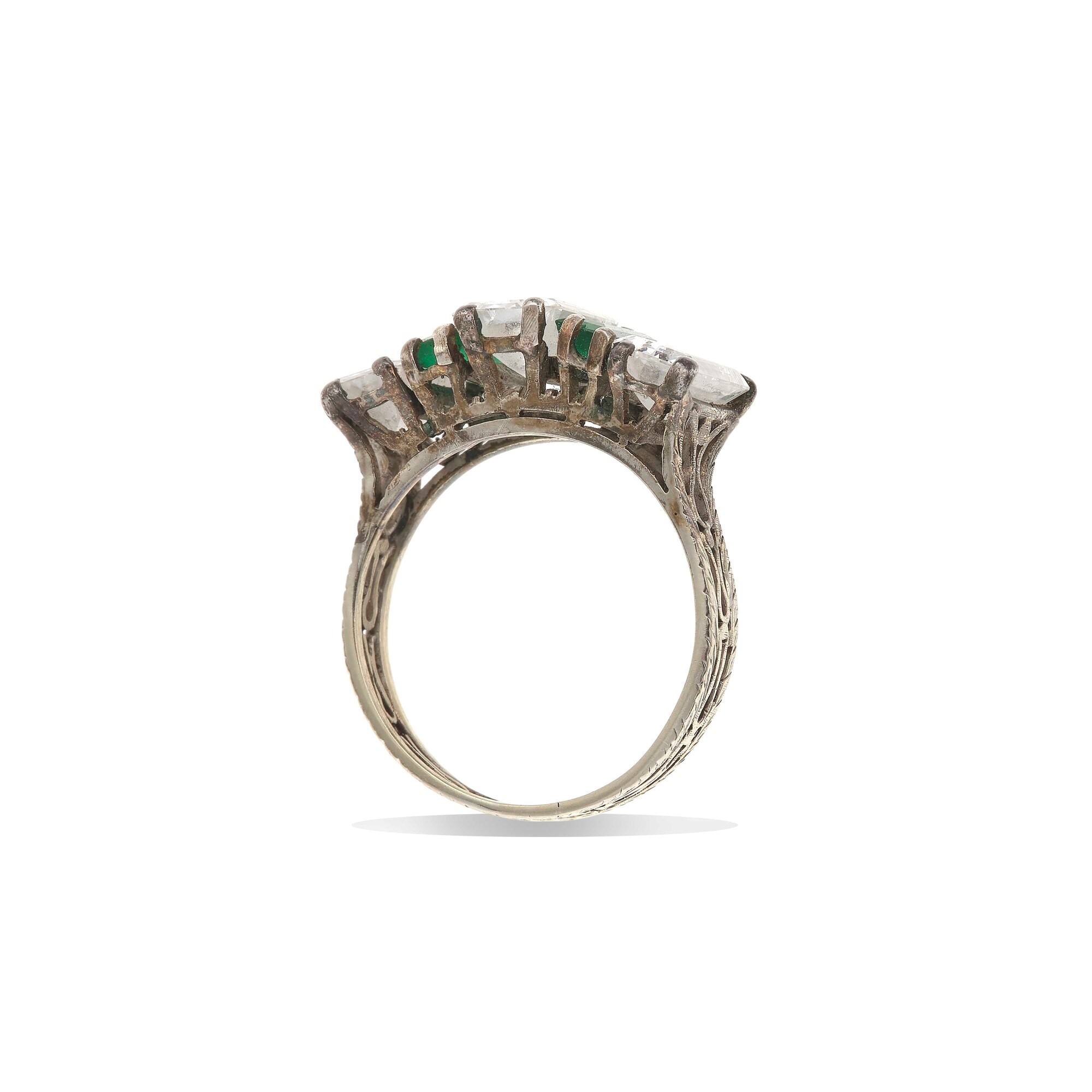 Anello con tre diamanti taglio smeraldo di ct 0.75, 1.00 e 0.75 circa e due smeraldi