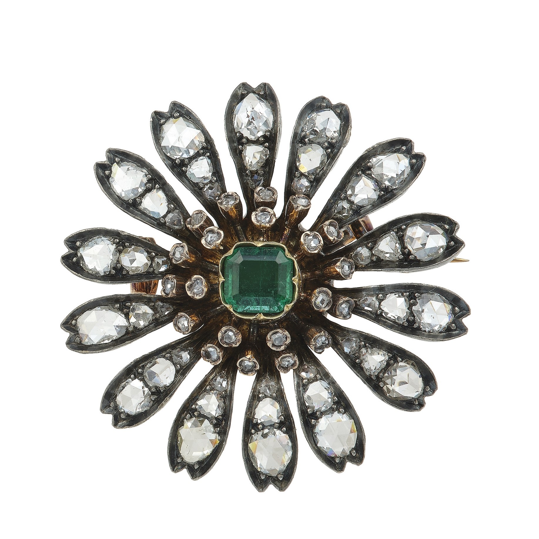 Spilla con smeraldo e diamanti di vecchio taglio montatura in argento ed oro...