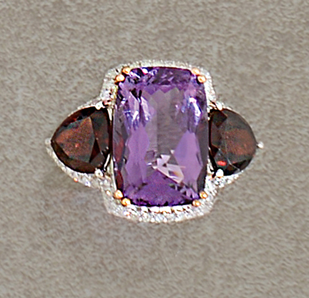 ANELLO. In oro bianco e rosa 18 kt centrato da ametista taglio cuscino di cts. 10,00 ca., ai lati due granati taglio trilliant per tot. cts. 5,00 ca. e diamanti taglio brillante per tot. cts. 0,40 ca.