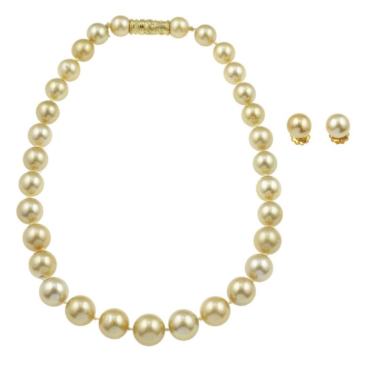 montature in oro giallo 750/1000. , Gemmological report Gübelin Gem Lab n. 9910072, gr. totali 141,2 lunghezza collana cm 40,5 diametro perle da mm 12,35 - 12,40 a mm 16,79 - 16,95 orecchini con chiusura a perno diametro perle 12,87 e 13,08 mm https://drive.google.com/drive/folders/1m2IgQPRbjaWHd3-l7heW91yTUSA6yGOe