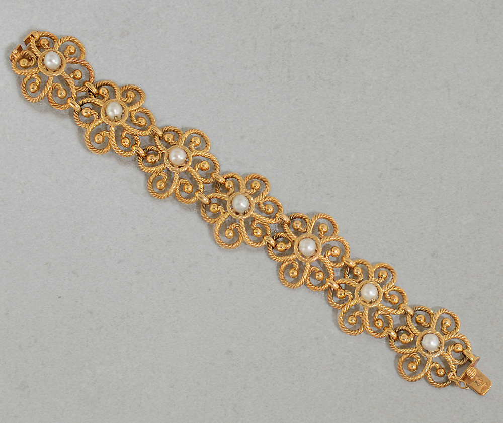 BRACCIALE ANNI '50 CA. In oro giallo 18 kt a grandi fiori in cordone ritorto con terminali a boules centrati da perle coltivate di mm 6 ca. disposte su filo passante.