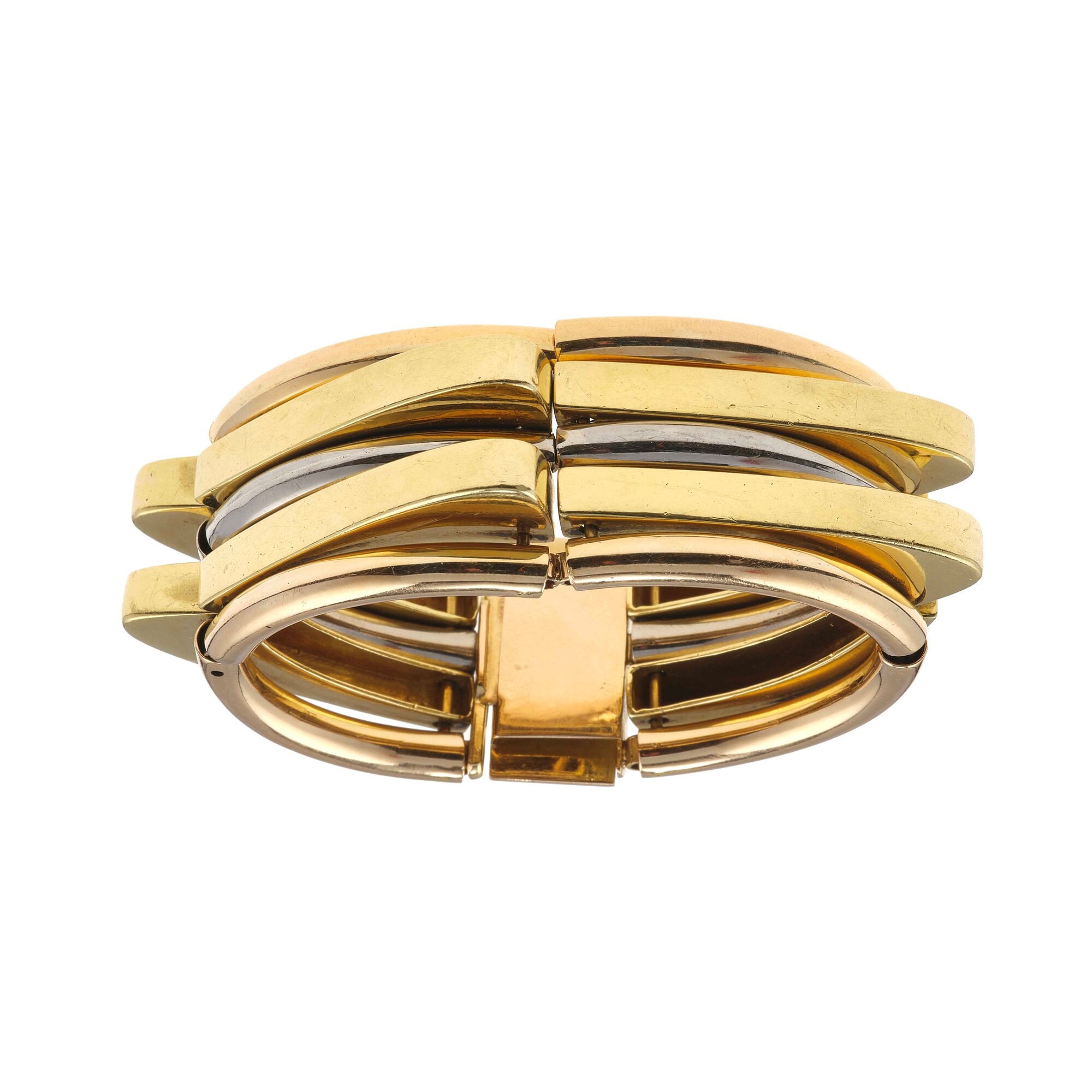 montatura in oro tre colori 750/1000 e chiusura in oro 14Kt. Lievi difetti, gr. 168 intewrnal diameter 6,0 x 6,0 cm approximately https://drive.google.com/drive/folders/164vmkhejJj7jTp0HXGvJFhxkox8Gh8Yb