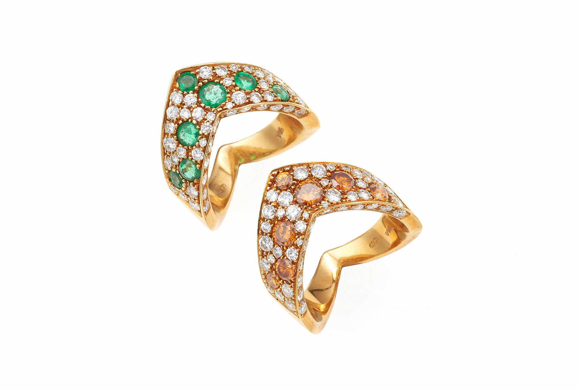 Due anelli con diamanti, smeraldi e diamanti gialli