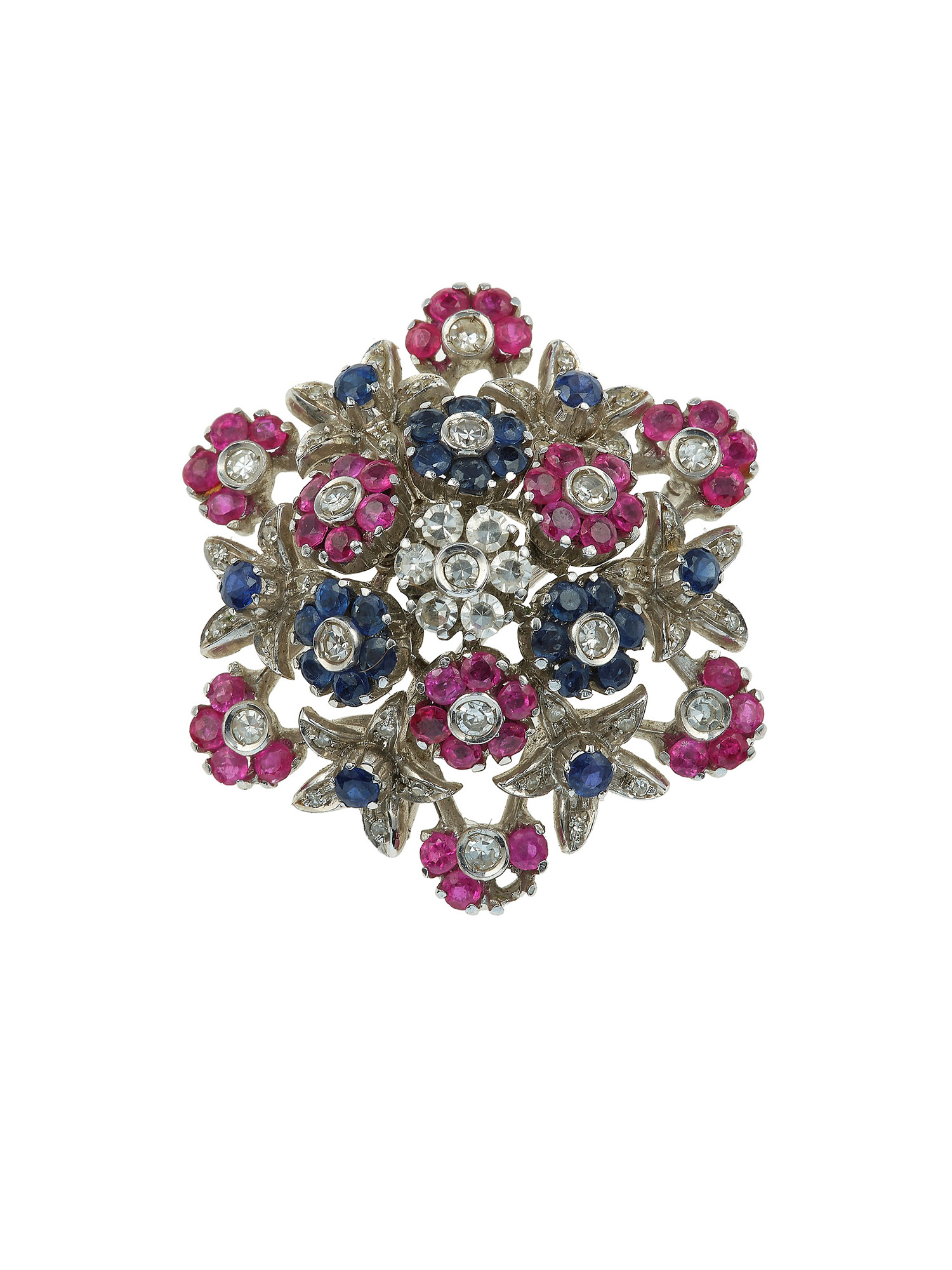 Spilla en tremblant con rubini, zaffiri e diamanti montatura in oro bianco...