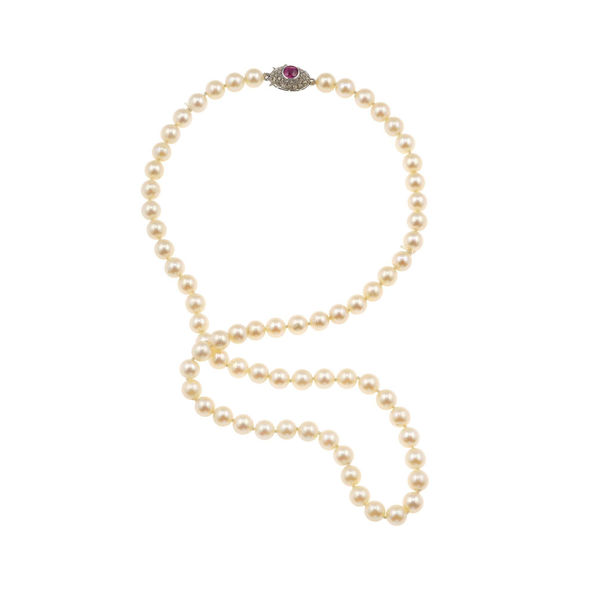 Filo di perle coltivate fermezza in oro bianco 750/1000 con rubino Burma di...