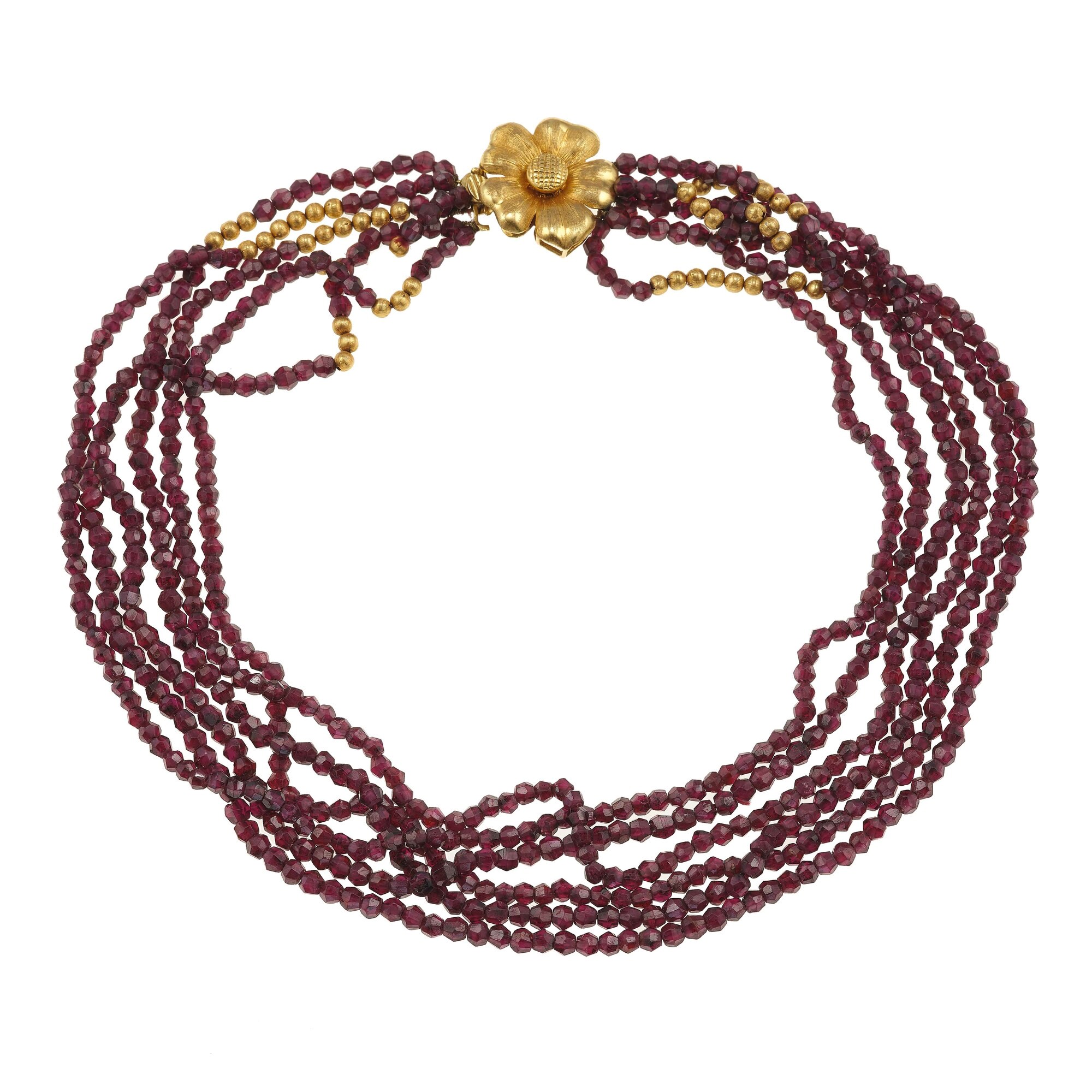 Girocollo a più fili con granati fermezza ed inserti in oro giallo 750/1000....
