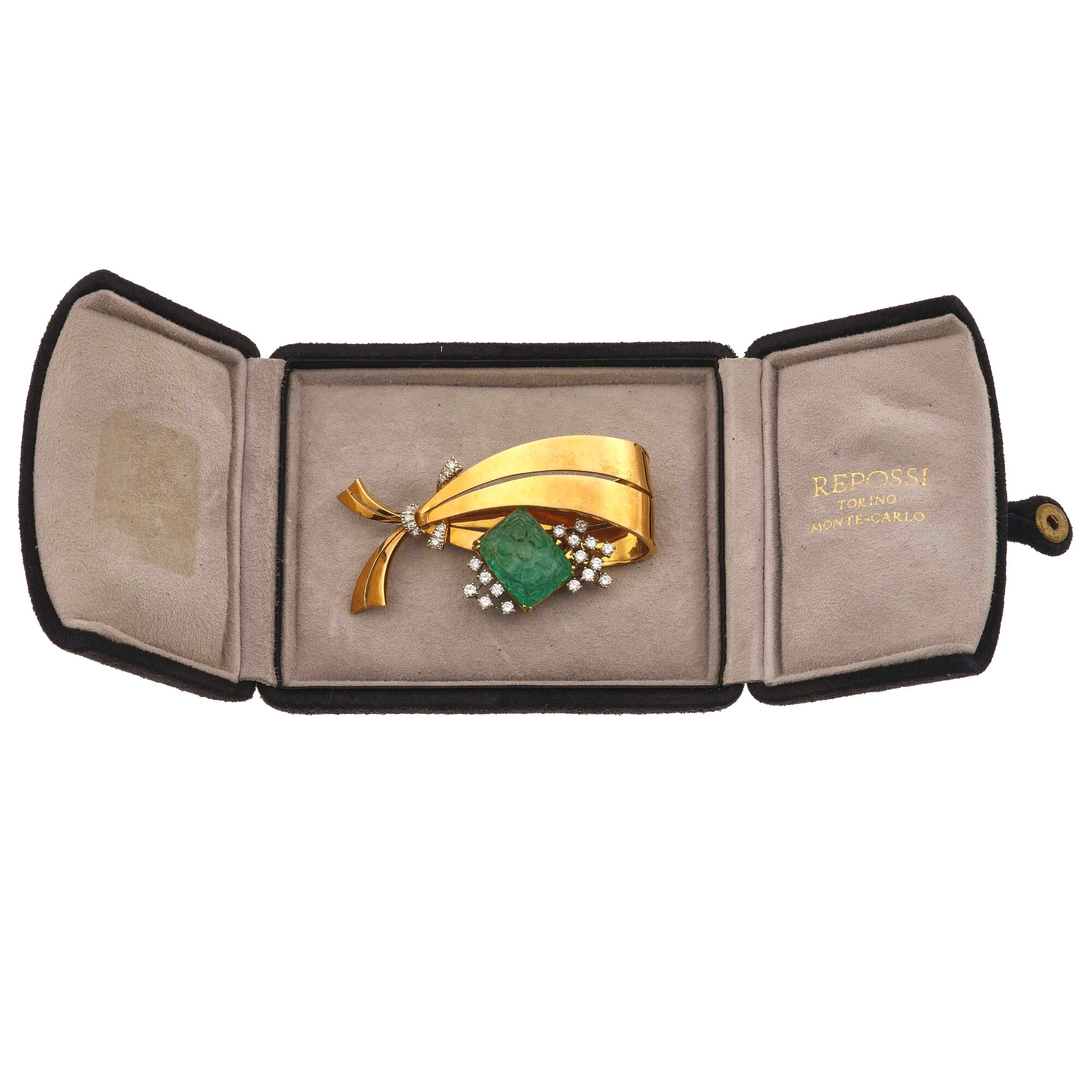 Costantino Repossi. Spilla con smeraldo inciso e piccoli diamanti, non...