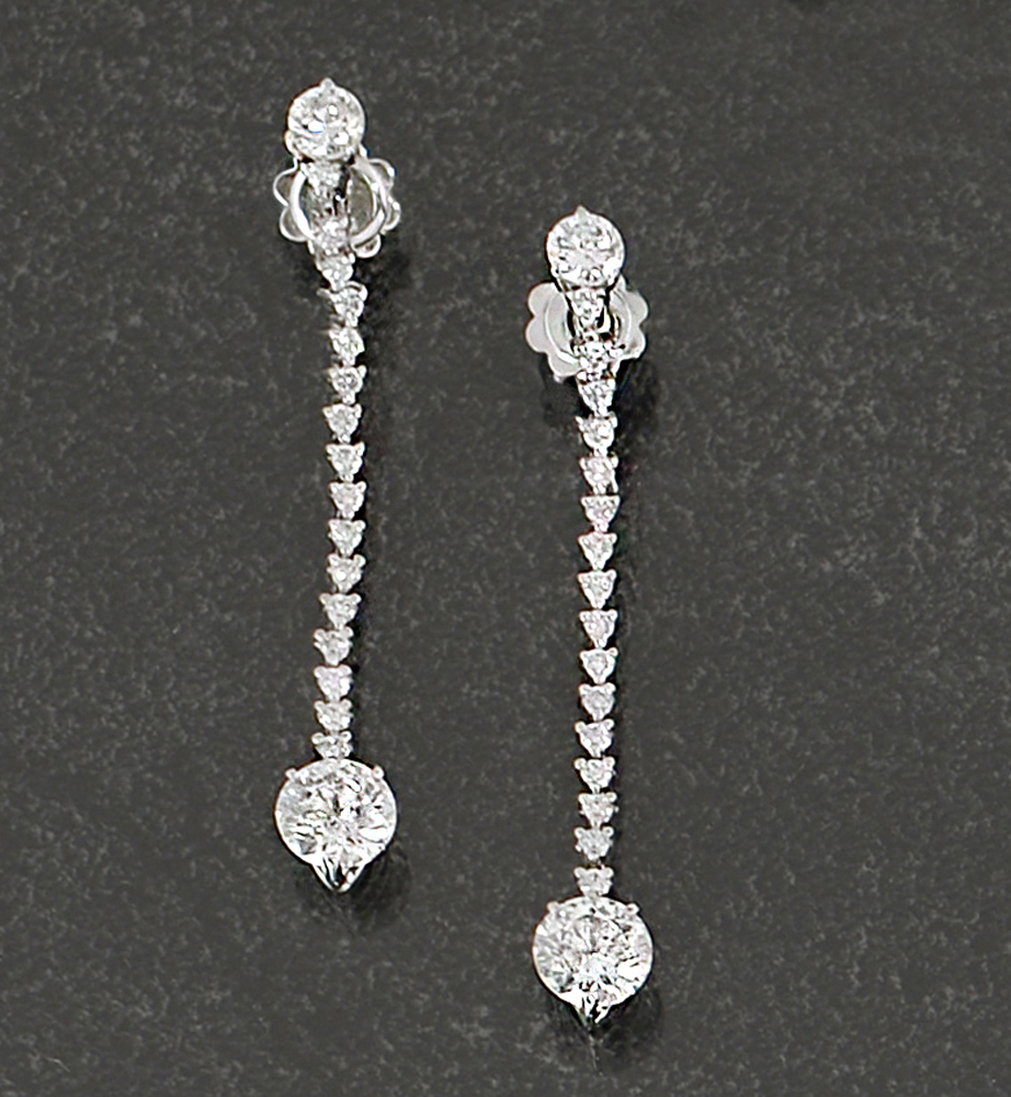 COPPIA DI ORECCHINI PENDENTI. In oro bianco 18 kt perno e farfalla realizzati a settori verticali in diamanti taglio brillante per tot. cts. 1,20 ca. terminanti con due diamanti taglio brillante per tot. cts. 2,18 (prob. colore F/G purezza P).
