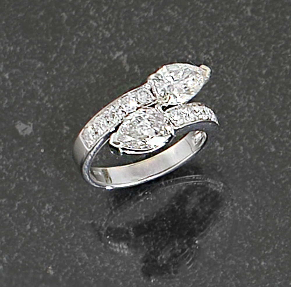 ANELLO. In oro bianco 18 kt con disposizione a contrariè, alla sommità due diamanti taglio goccia per tot. cts. 1,80 ca. entro decoro laterale in diamanti taglio brillante per tot. cts. 0,40 ca.