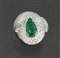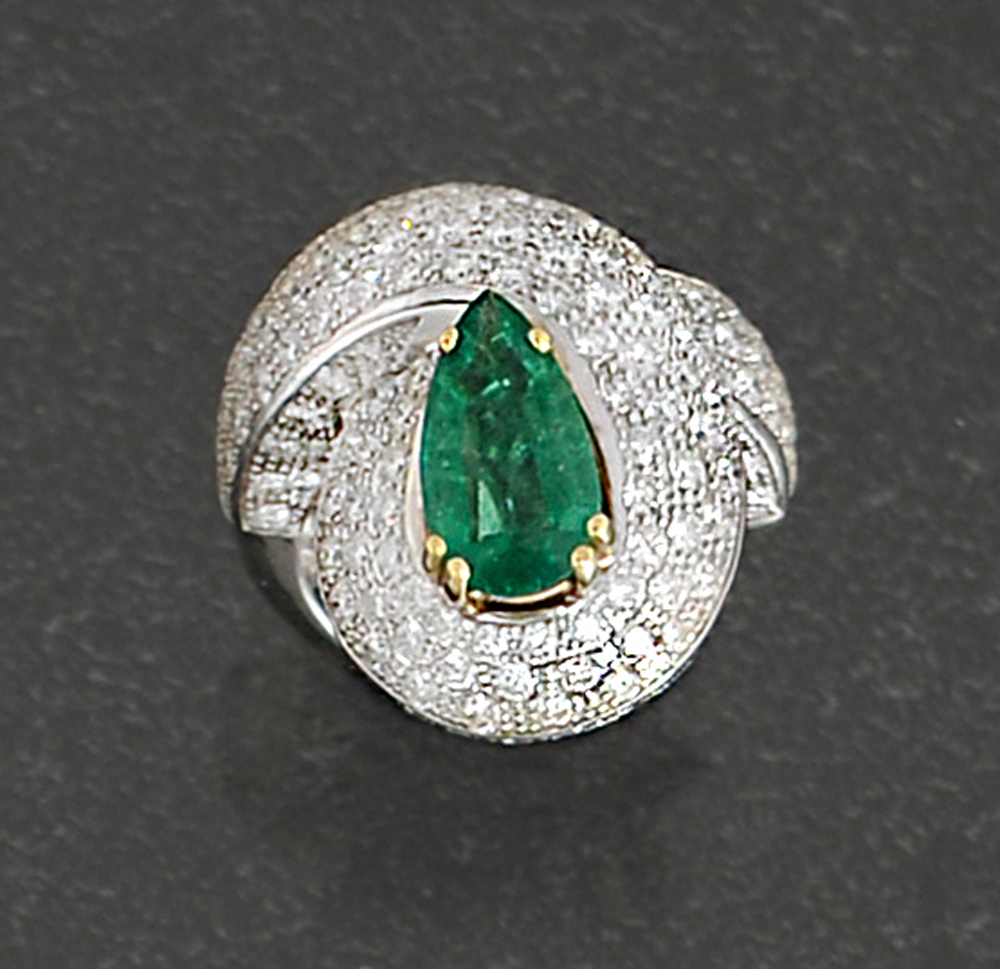 ANELLO. In oro bianco e giallo 18 kt internamente foderato realizzato a fasce incrociate con al centro smeraldo taglio goccia di cts. 2,20 ca. entro decoro in diamanti taglio brillante disposti a pavè per tot. cts. 3,20 ca.