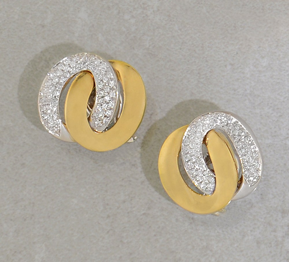 COPPIA DI ORECCHINI. In oro giallo e bianco 18 kt perno e clip con settori ovali intrecciati decorati da diamanti taglio brillante per tot. cts. 1,00 ca.