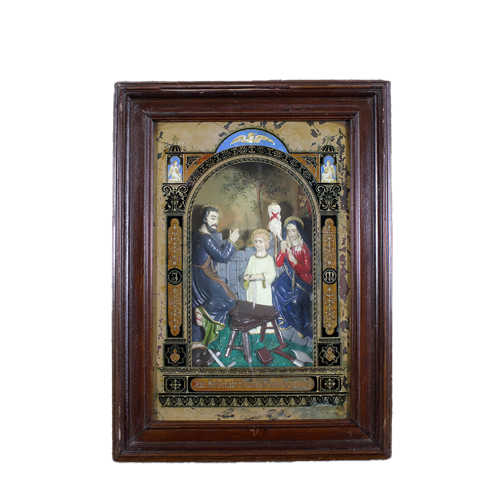 TECA raffigurante sacra famiglia con alto rilievo in gesso dipinto h cm 66,5 x 49
