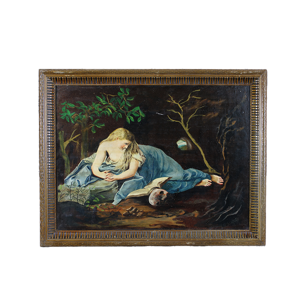 OLIO SU TELA INCOLLATA SU FAESITE raffigurante S. Rosalia all'interno di una grotta E. Bernath 1967 h cm 48 x 63 / h cm 57 x 72