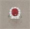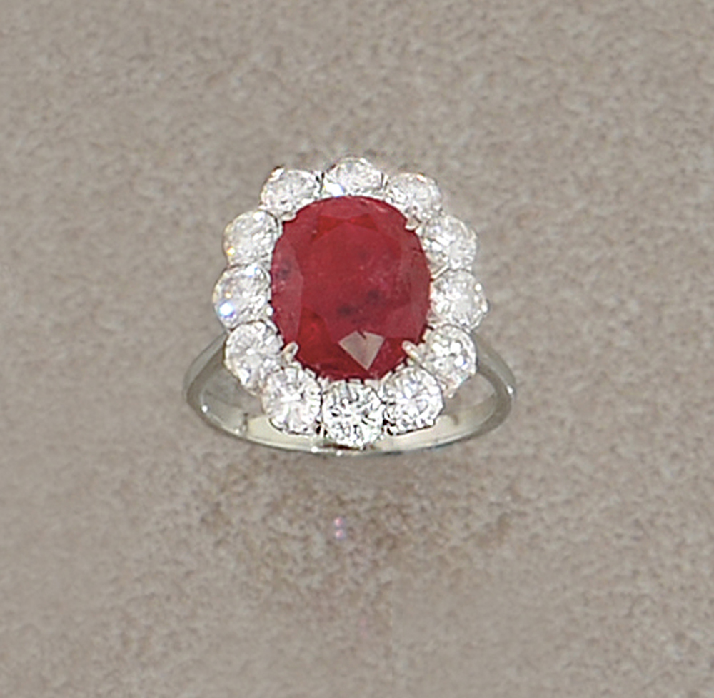 ANELLO. In oro bianco 18 kt a fiore con al centro rubino taglio ovale di cts. 4,00 ca. (presenza di sostanze estranee infiltrate e mancanza di materiale) entro contorno in diamanti taglio brillante per tot. cts. 1,80 ca., con allegata verifica gemmologica n. 20114-0725 Dott. Carlo Cumo Valenza.