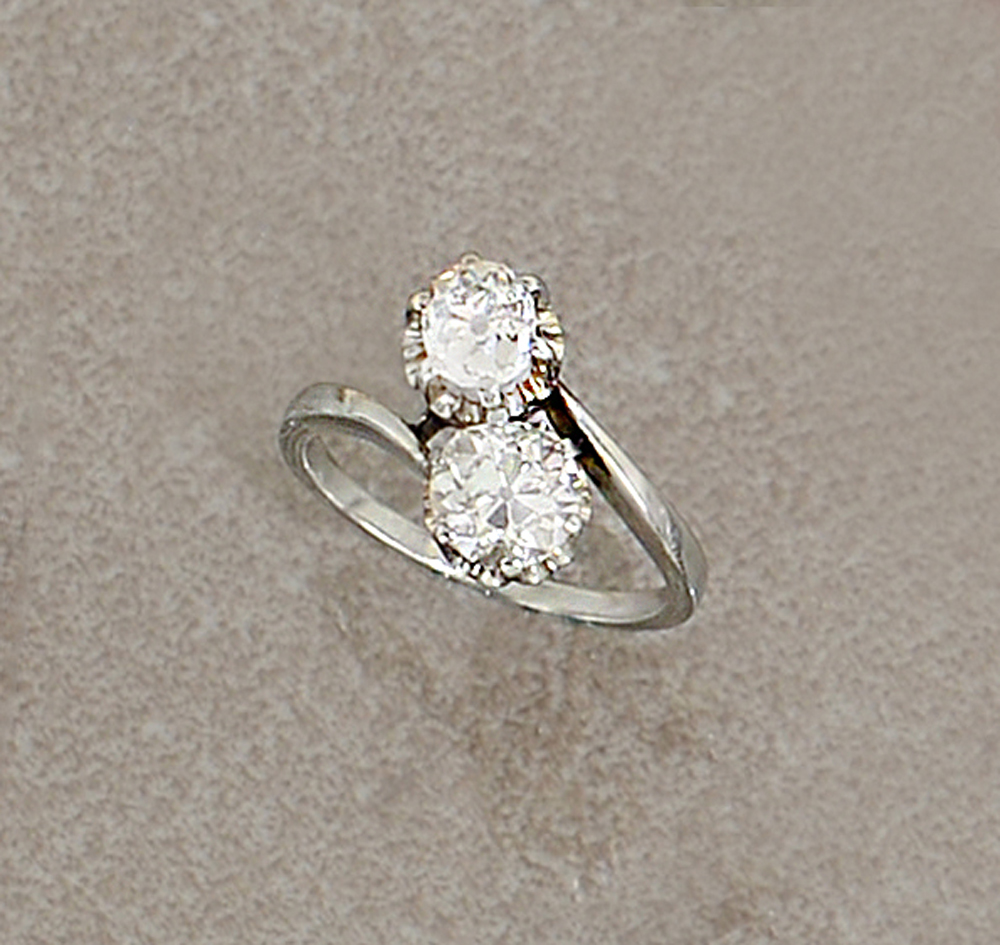 ANELLO. In oro bianco 18 kt con due diamanti taglio vecchio disposti a contrariè per tot. cts. 1,80 ca. entro castoni a sei griffes.
