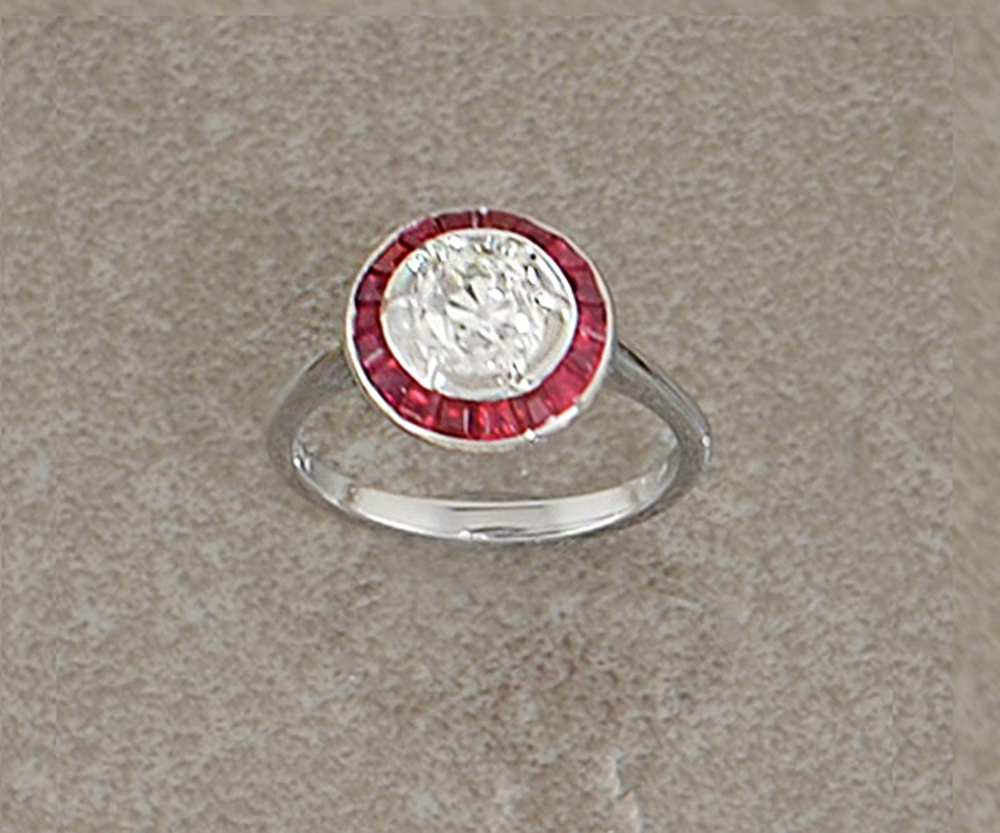 ANELLO. In oro bianco 18 kt con al centro diamante taglio vecchio di cts. 1,20 ca. (prob. colore M purezza VS) entro cornice in rubini taglio fantasia per tot. cts. 0,30 ca.