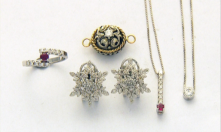 LOTTO DI QUATTRO GIOIELLI. In oro bianco, giallo 18 kt ed argento composto da coppia di orecchini a fiore perno e clip, una demi parure (anello e ciondolo con catenina), una fermezza ed un ciondolo con punto luce, diamanti taglio brillante per tot. cts. 1,20 ca. e rubini taglio rotondo per tot. cts. 0,30 ca.