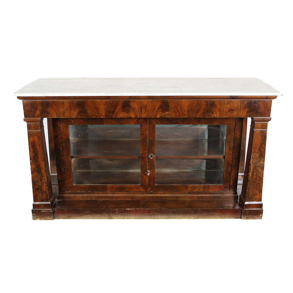 IMPORTANTE CONSOLLE IMPERO con vetrina nella parte inferiore in piuma di mogano, piano in marmo bianco di Carrara Sicilia XIX secolo h cm 93 x 170 x 60