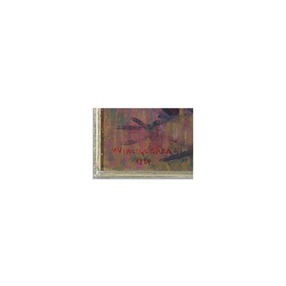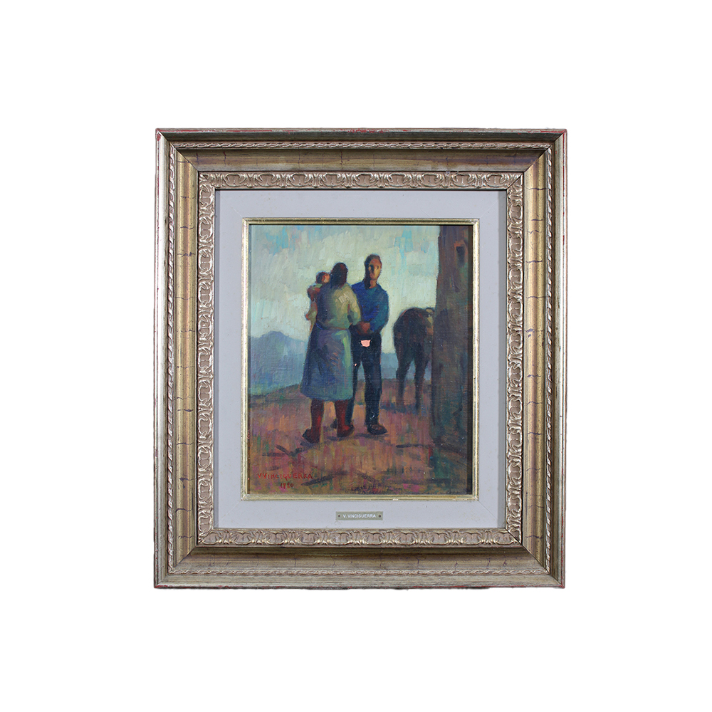 VINCENZO VINCIGUERRA olio su tavola raffigurante personaggi provenienza Galleria Raffaello h cm 25 x 30 - cornice h cm 51 x 46