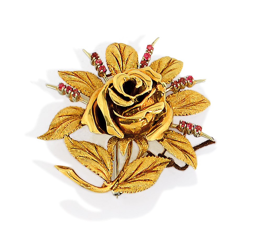 SPILLA ANNI '50 CA. In oro giallo 18 kt a grande rosa con foglie incise decori in rubini taglio rotondo per tot. cts. 0,50 ca., chiusura ad ago semplice.