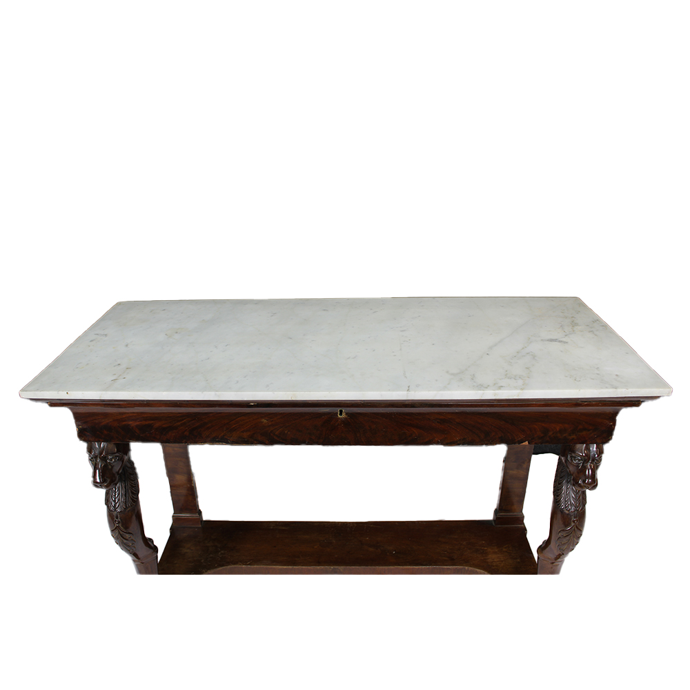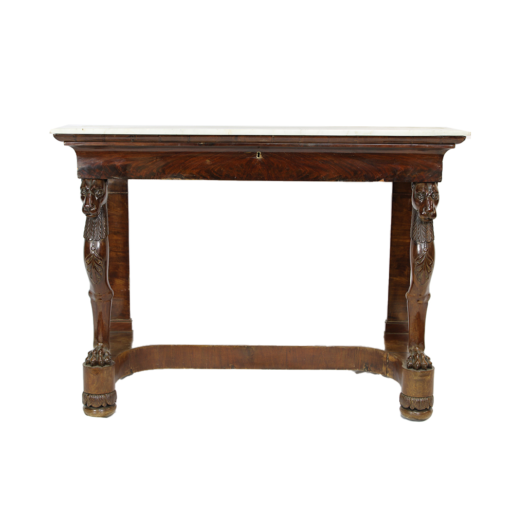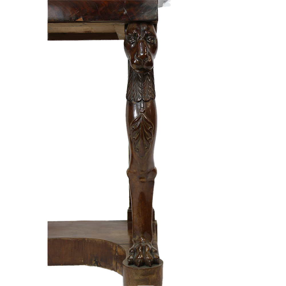CONSOLLE IMPERO in mogano e piuma di mogano, sorrette da gambe in legno finemente scolpite raffigurante figure leonine con cassetto, piano in marmo bianco di Carrara Sicilia primi 800 h cm 100 x 134 x 57,5