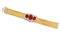 BRACCIALE. In oro giallo e bianco 9 kt maglia a tessuto leggermente elasticizzato con al centro motivo a tre rubini taglio ovale cabochon per tot. cts. 15 ca. (visibili sostanze estranee atte a migliorare colore e purezza) entro cornici in diamanti taglio brillante per tot. cts. 0,60 ca.
