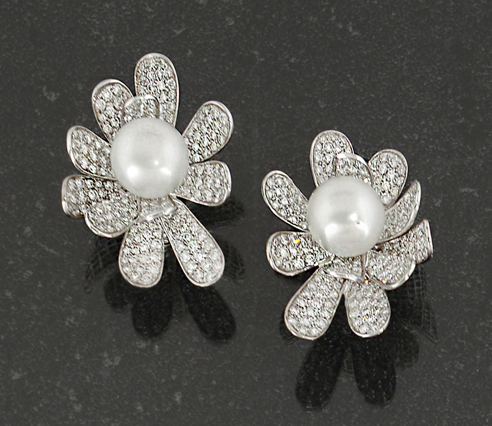 COPPIA DI ORECCHINI. In oro bianco 18 kt perno ripieghevole e clip a grandi fiori centrati da perle coltivate South Sea di mm 13 ca. entro petali in diamanti taglio brillante per tot. cts. 10,00 ca.