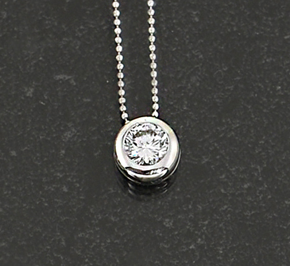 CIONDOLO. In oro bianco 18 kt con diamante taglio brillante entro castone a cipollina di cts. 1,20 colore L purezza SI trattenuto da fine collanina in oro bianco 18 kt, il gioiello è accompagnato da certificato Bidibi s.r.l.