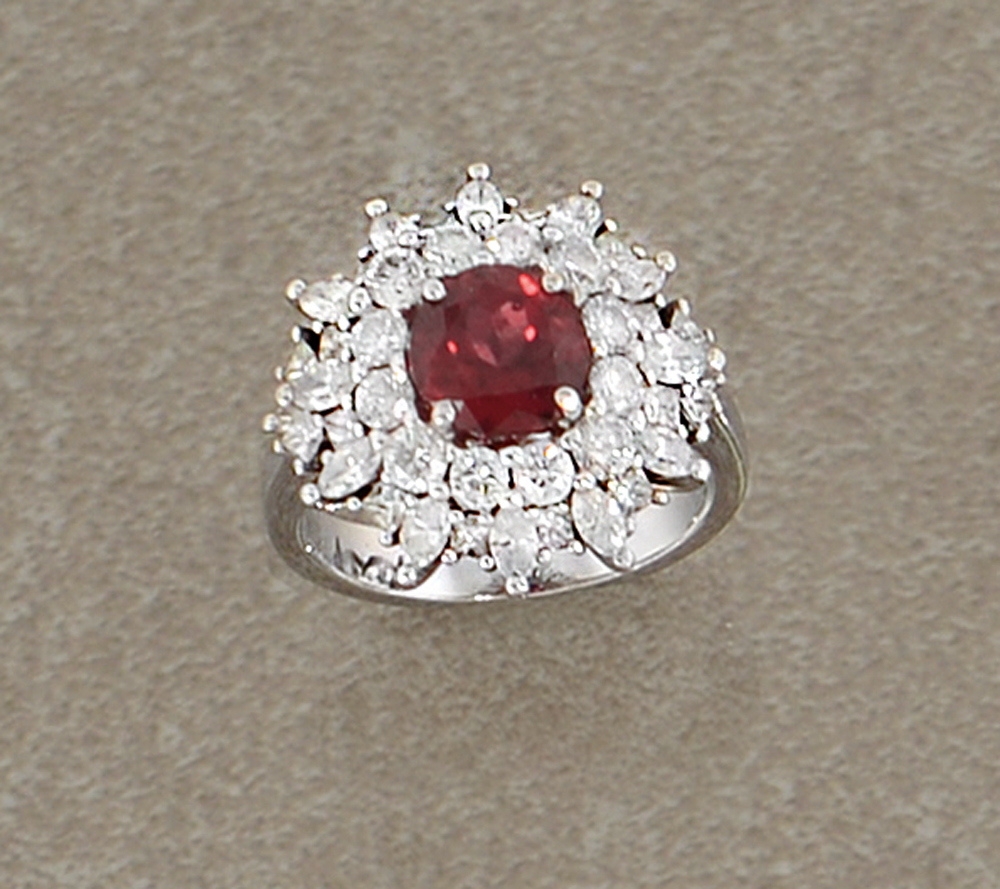 ANELLO. In oro bianco 18 kt centrato da rubino taglio rotondo di cts. 2,50 ca. entro doppio giro di diamanti taglio brillante, carrè e navette per tot. cts. 2,00 ca.