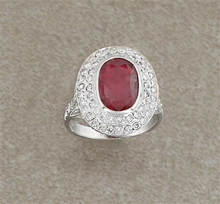 ANELLO. In platino con rubino Burma (Myanmar) taglio ovale di cts. 2,40 ca. (nessuna indicazione di trattamento termico) diamanti taglio brillante su bordure milligranate per tot. cts. 1,98 ca. con allegato Certificato gemmologico N.CDC1410151 del 14/10/2014 C.Dunaigre Lucerna.