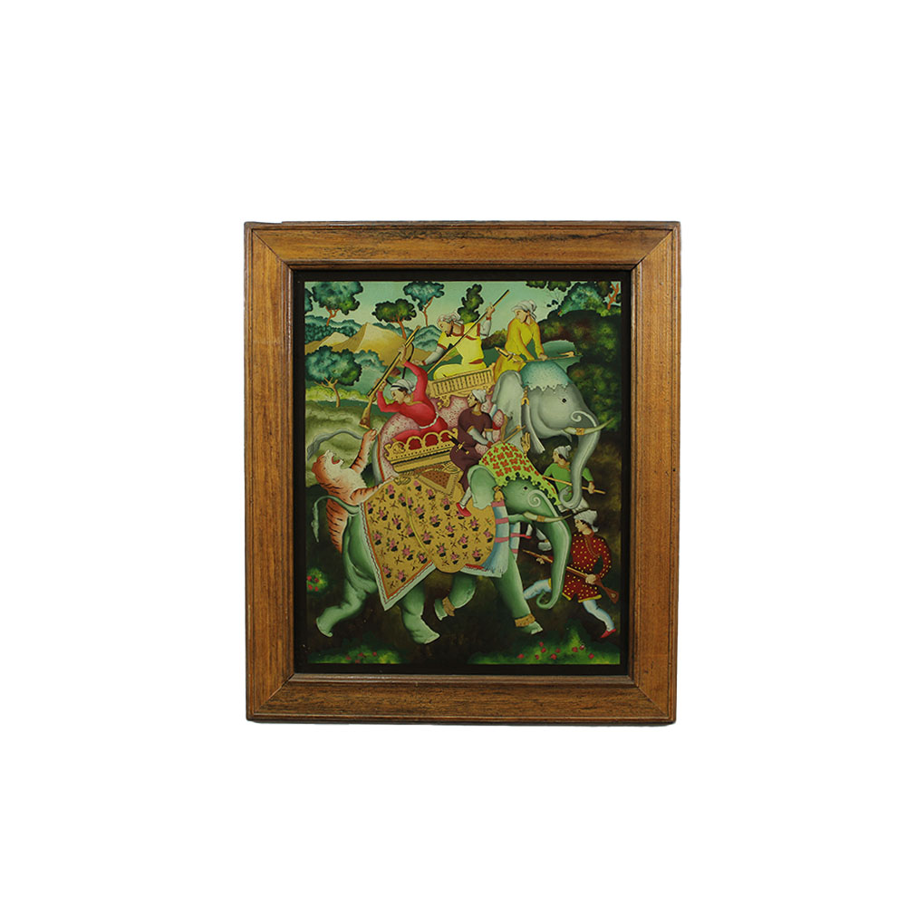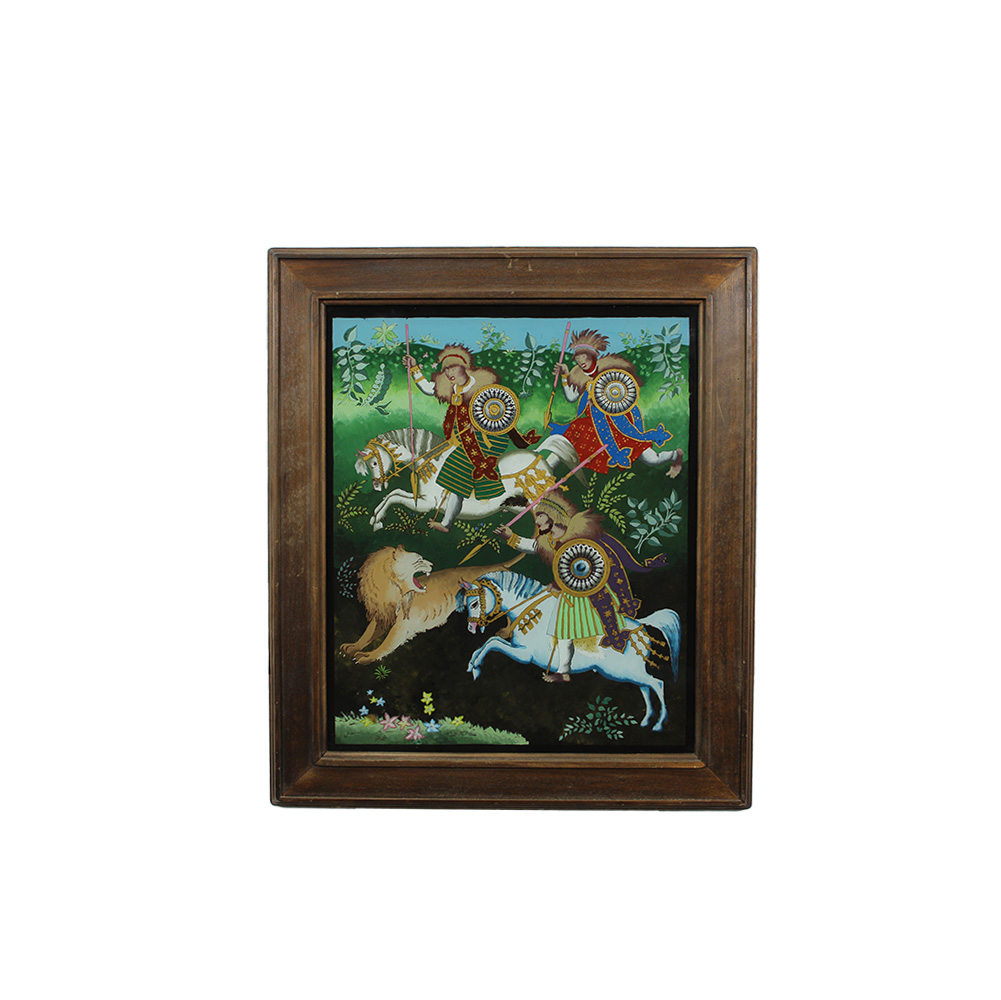 COPPIA DI PITTURE SU VETRO raffigurante scene di caccia dentro cornice in legno manifattura orientale XX secolo h cm 59 x 48 - cornice h cm 74 x 64