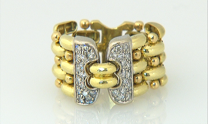 ANELLO. In oro giallo e bianco 18 kt maglia morbida con centrale fiocco in diamanti taglio huit-huit per tot. cts. 0,20 ca.