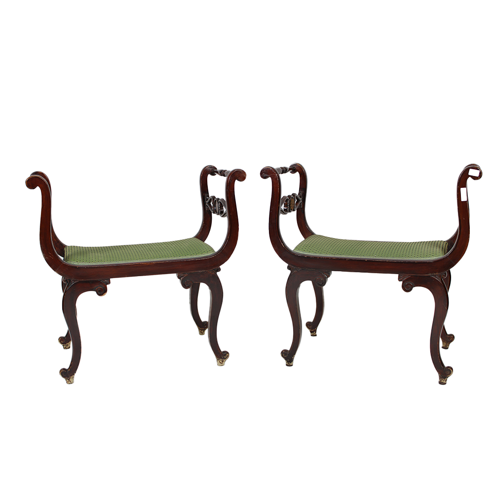 COPPIA DI SGABELLI FALDISTORI in legno di mogano con seduta in tessuto Italia XIX/XX secolo h cm 65 x 67 x 38