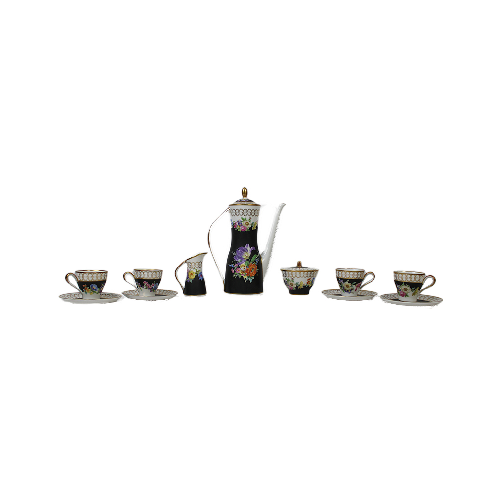 SERVIZIO DA CAFFÈ COMPOSTO DA caffettiera, lattiera, zuccheriera e 4 tazzine con piattino in porcellana dipinta a motivi floreali, manifattura Vieux Limoges Francia primi 900 misure varie