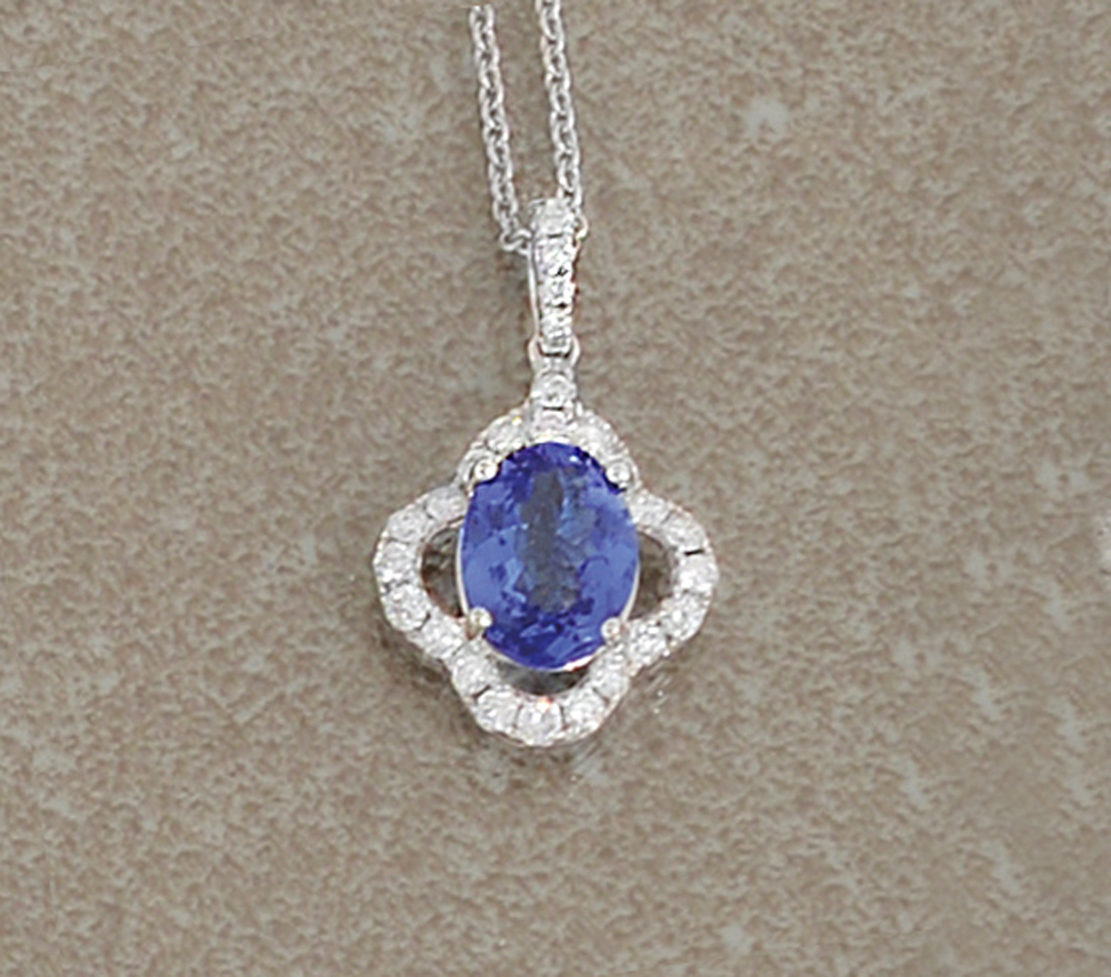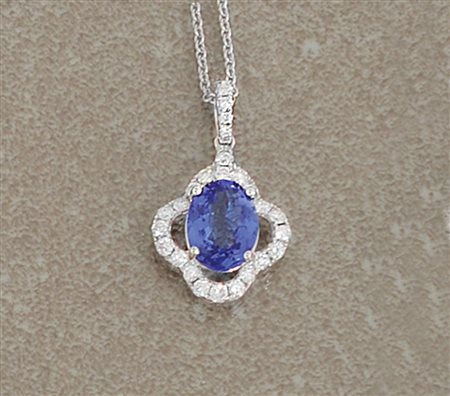 CIONDOLO. In oro bianco 18 kt centrato da tanzanite taglio ovale di cts. 2,40 ca. entro cornice quadrilobata in diamanti taglio brillante per tot. cts. 0,50 ca., trattenuto da fine catenina in oro bianco 18 kt.
