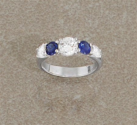 ANELLO. In oro bianco 18 kt con al centro diamante taglio brillante di cts. 0,70 ca. ai lati due diamanti taglio brillante per tot. cts. 0,30 ca. e due zaffiri taglio rotondo per tot. cts. 0,80 ca.