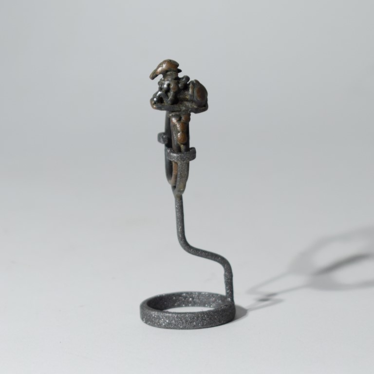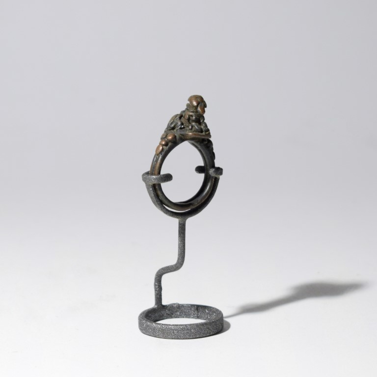 An example of popular ritual goldsmithing, this bronze ring features the figure of Nandi, the sacred bull who serves as the vehicle and guardian of the god Shiva-a central figure in Hindu iconography. The cast use the direct lost-wax technique and devoid of ornamental finishes, the piece retains the essentiality and expressive power typical of devotional craftsmanship.
