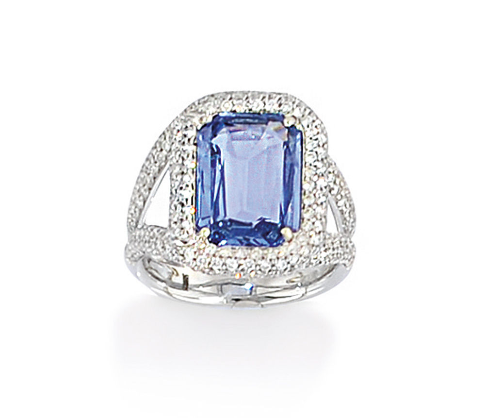 ANELLO. In oro bianco 18 kt con zaffiro Sri Lanka (Ceylon) taglio ottagonale di cts. 5,93 ca. e diamanti taglio brillante a contorno e decoro della montatura per tot. cts 1,38 ca. accompagnato da Certificato gemmologico N.CDC1410157 del 14/10/2014 C.Dunaigre Lucerna.