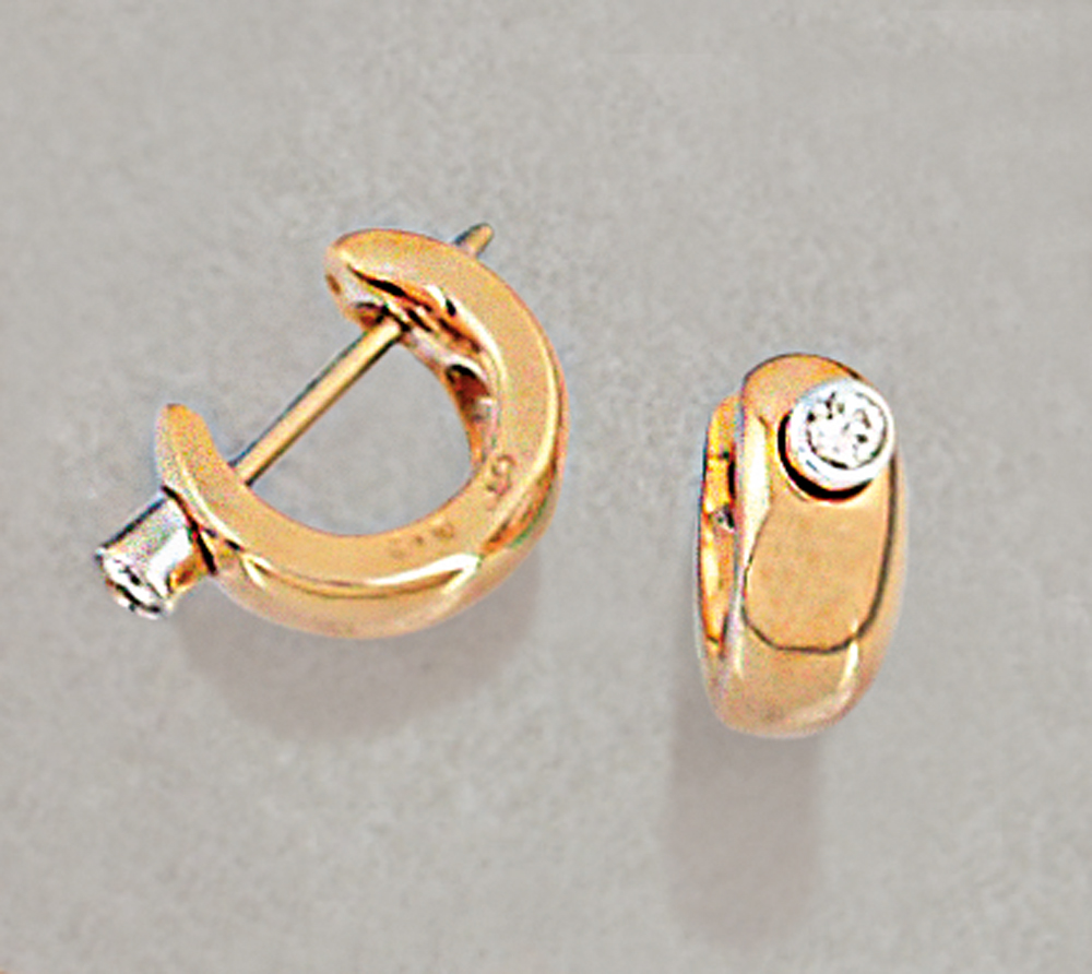 COPPIA DI ORECCHINI DI POMELLATO. In oro giallo e bianco 18 kt collezione "PIERCING" a perno sfilabile, realizzati a mezzo cerchio, diamanti taglio brillante per tot. cts. 0,10 ca. con allegato certificato in bianco originale.