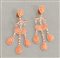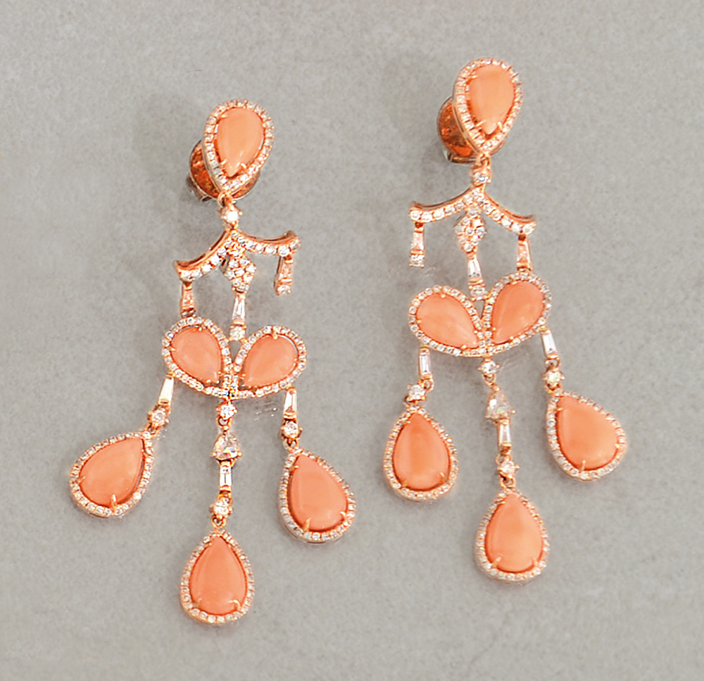 COPPIA DI ORECCHINI PENDENTI. In oro rosa 18 kt perno e farfalla con diamanti taglio rosa, brillante e tapered baguette per tot. cts. 2,00 ca. ed inserti in corallo Giappone taglio goccia.