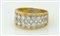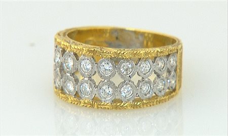 ANELLO. In oro giallo e bianco 18 kt con raffinati decori incisi a cesello e bulino, al centro doppia fila di diamanti taglio brillante per tot. cts. 1,00 ca.