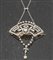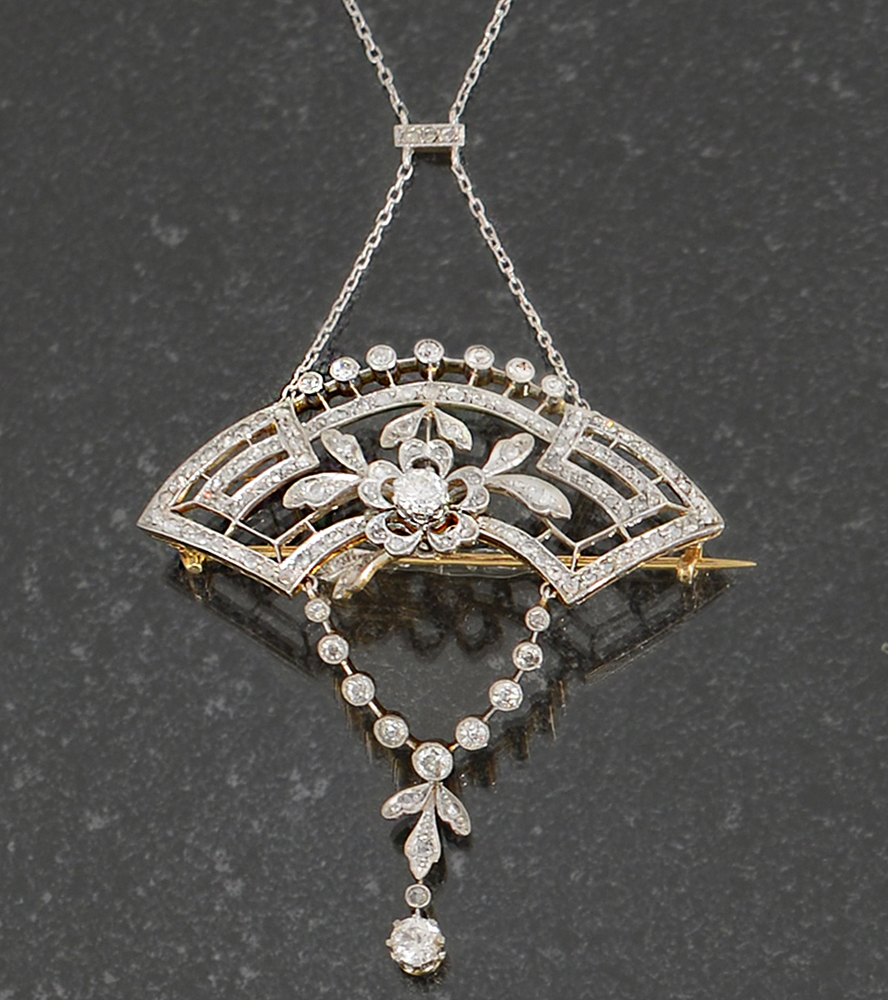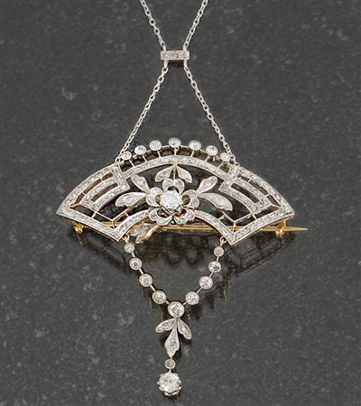 SPILLA-CIONDOLO. In oro bianco e giallo 18 kt di ispirazione anni '20 ma di più recente realizzazione, decoro frontale traforato con diamanti taglio vecchio e rosa per tot. cts. 1,50 ca., decoro a milligrano trattenuto da fine catenina.