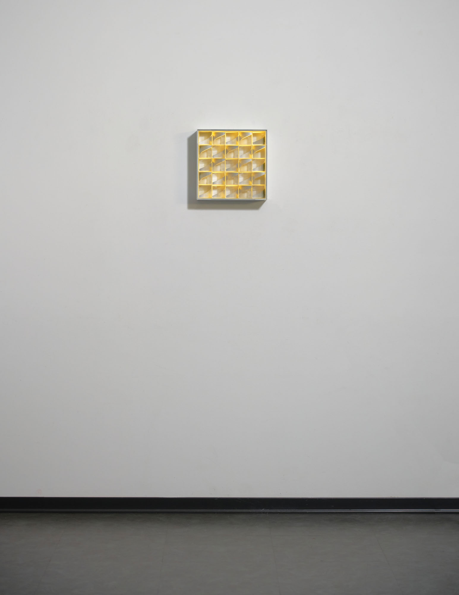 Assemblaggio, 25 cubi in box di legno e plexiglas, cm 36 x 36