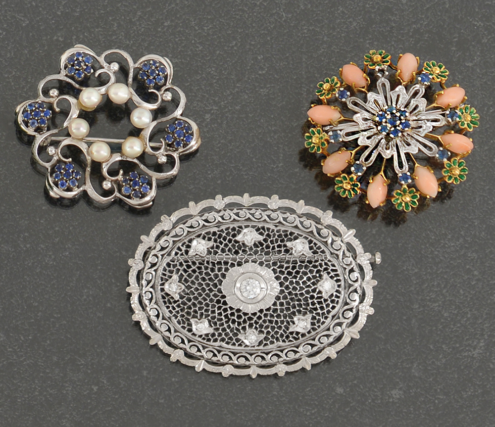 LOTTO DI TRE SPILLE ANNI '60 CA. In oro bianco e giallo 18 kt di diversa forma e raffigurazione con decori in corallo cabochon, perle coltivate di mm 4 ca., smalto verde, zaffiri taglio rotondo per tot. cts. 1,20 ca. (uno mancante) e diamanti taglio brillante e huit-huit per tot. cts. 0,30 ca.