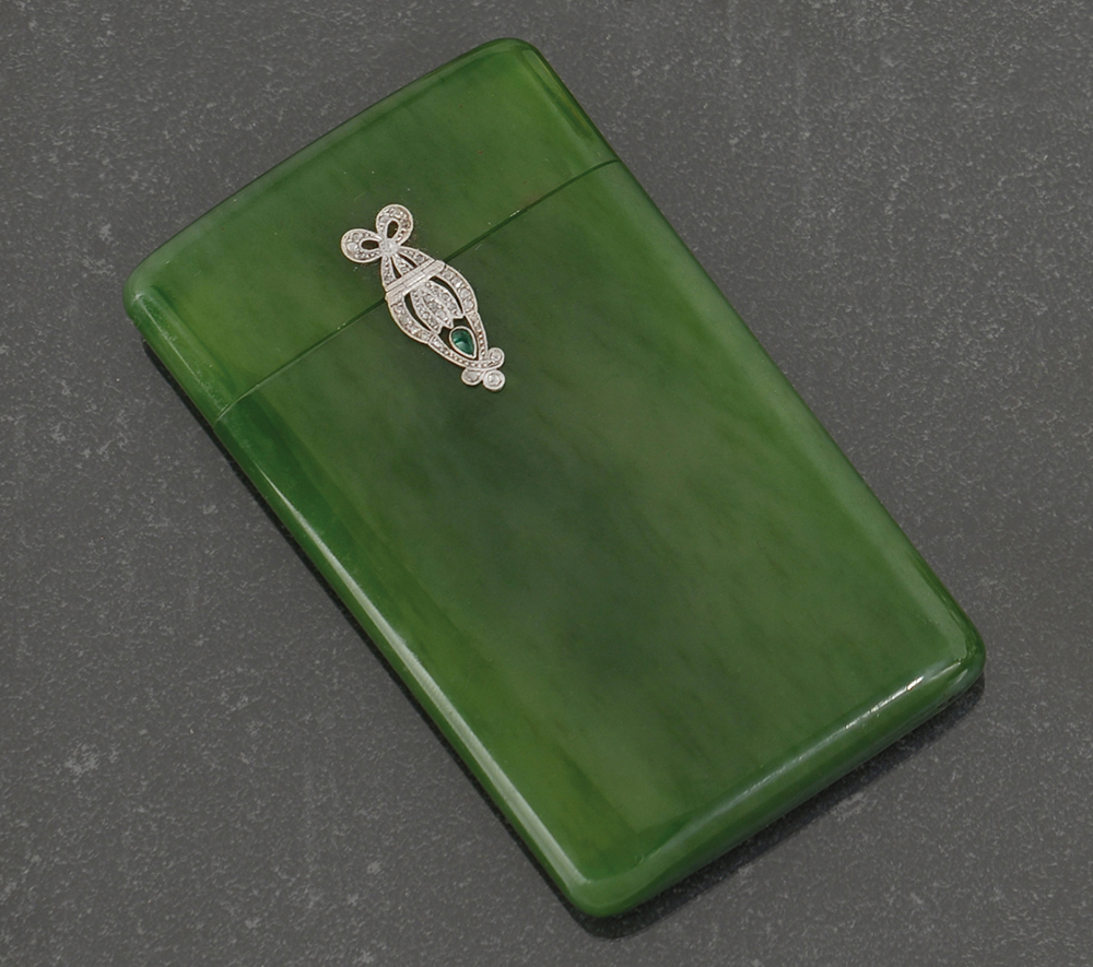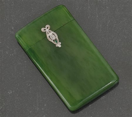 PORTA SIGARETTE ANNI '30 CA. In giada con inserti in oro bianco 18 kt, diamanti taglio rosa entro bordure milligranate, piccola gemma verde taglio goccia cabochon (prob. smeraldo).