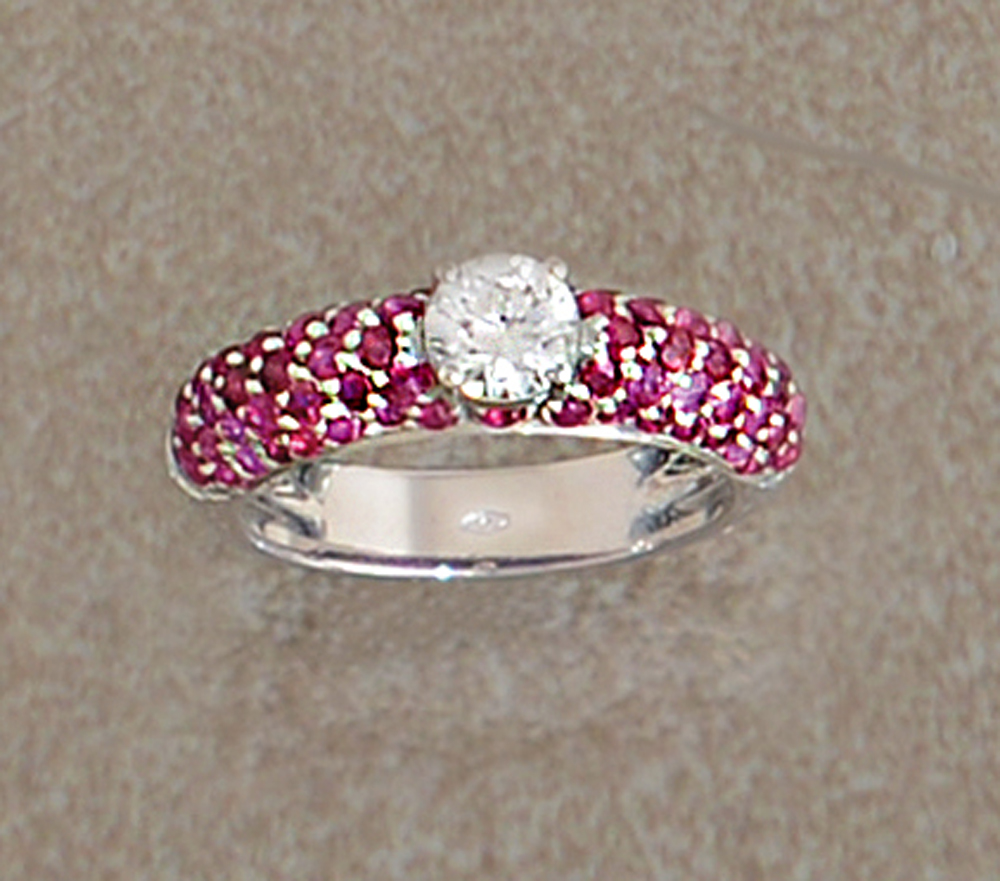ANELLO. In oro bianco 18 kt con rubini taglio rotondo per tot. cts. 1,50 ca. ed al centro un diamante taglio brillante di cts. 0,50 ca.