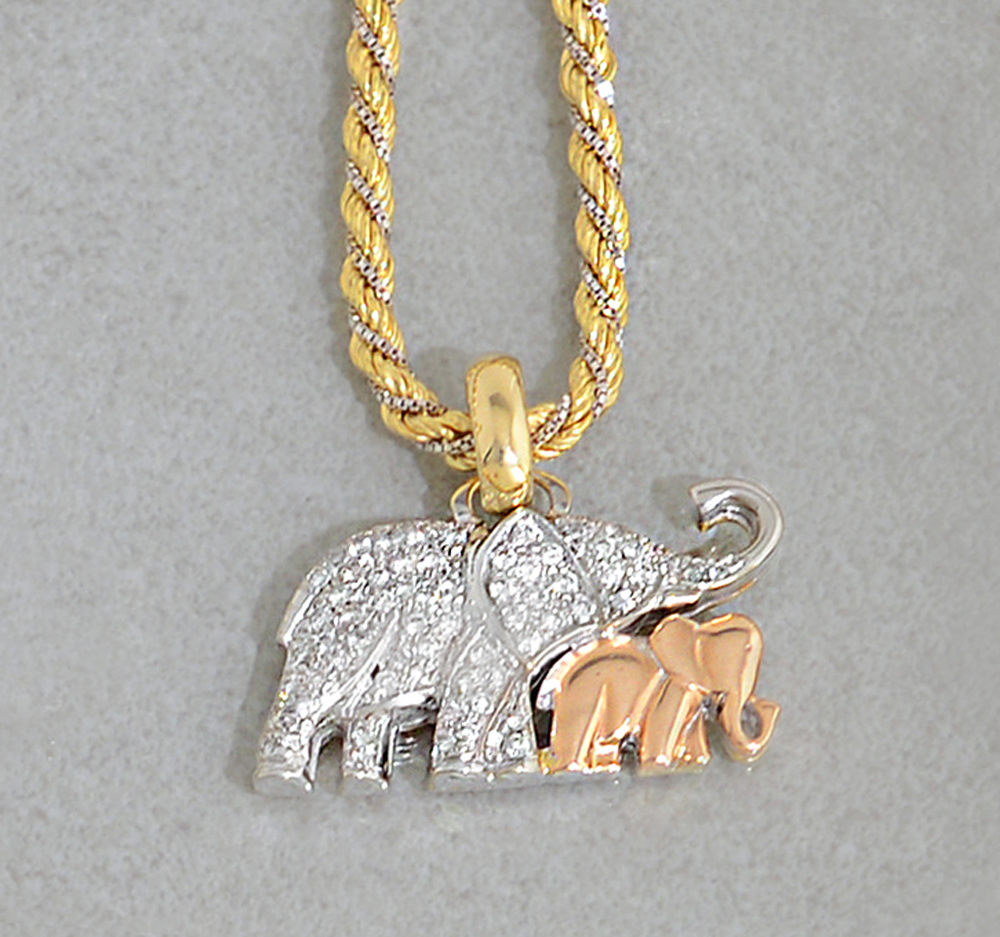CIONDOLO. In oro bianco, rosa e giallo 18 kt motivo a due elefantini con decoro in diamanti taglio brillante per tot. cts. 1,20 ca., trattenuto da catena in oro bianco e giallo 18 kt a maglia tubolare ritorta.