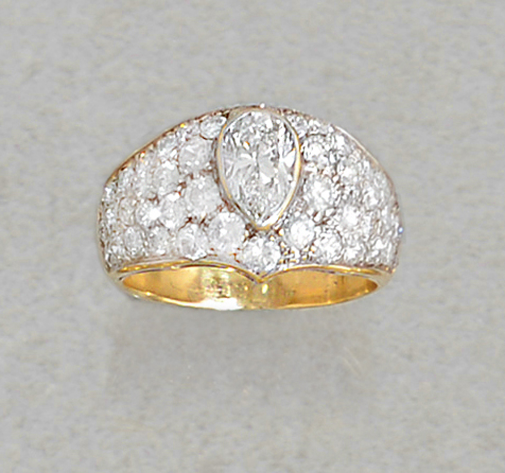 ANELLO. In oro giallo e bianco 18 kt a fascia con al centro diamante taglio goccia di cts. 1,00 ca. (prob. colore J purezza VVS) diamanti taglio brillante sulla montatura per tot. cts. 1,50 ca.